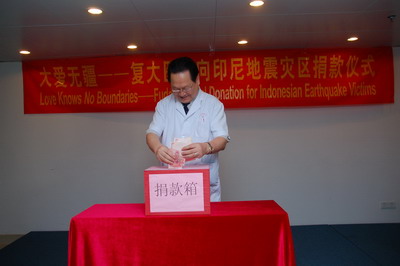 2009年10月19日早上8点半,复大医院除留守工作岗位以外的医务人员都聚集在9楼会议室,听徐克成院长讲述印尼发生地震民众受灾的情况,他激动地讲述了,中国四川5.12大地震给灾区人民带来巨大伤害,当时来自世界各国的友人都在第一时间伸出援助之手,印尼人民也同样如此。现在不幸的灾难发生在印尼苏门达腊,我们也应该伸出我们的友爱之手,贡献微薄之力,希望苏门达腊灾区的朋友们能早日从困境中恢复过来。