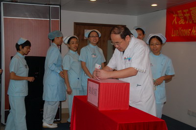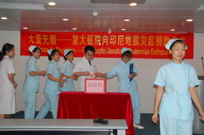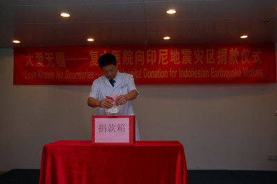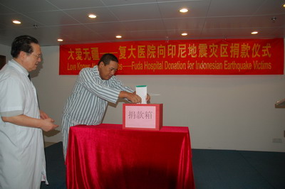 随着会场响起“爱的奉献”歌声,复大医院员工向印尼灾区捐款仪式正式开始--徐院长、左院长、牛院长带头捐款,随后员工们鱼贯而行,纷纷上台捐献自己的一份爱心!