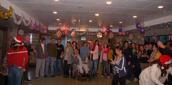 不同国家,不同语言的朋友们,此刻相拥在一起,共同欢唱着英文圣诞歌曲。随着这些欢快的节奏,平常只能躺在病床的患者们,奇迹般相互扶搀站了起来,一起踏着节拍,快乐的舞动着双手双脚。我们的医务人员也被此情此景深深感染,牛立志院长带着医生、护士与大家一起上台表演,有的献上自己最喜爱的歌曲,有的同患者友们一起舞蹈,一个大家庭共同欢庆着圣诞……