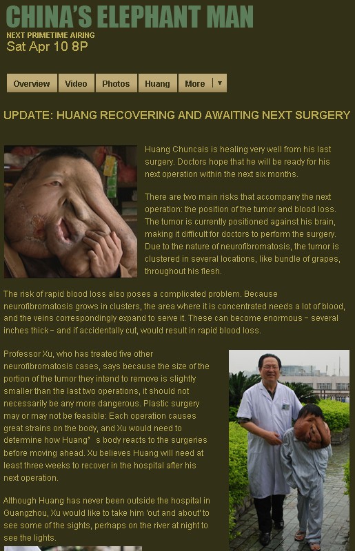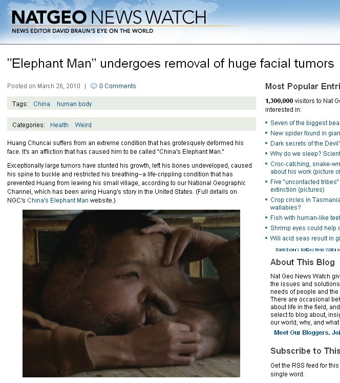 A news title called “Elephant Man" undergoes removal of huge facial tumors ”was posted on Reuter~s website in march 26, 2010